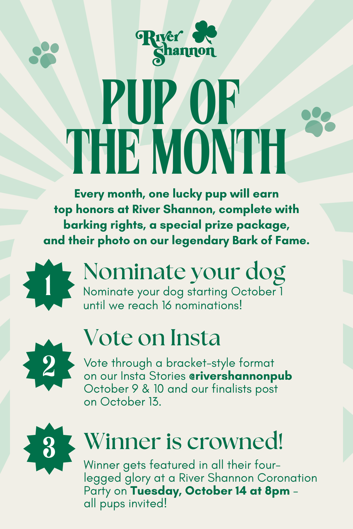 -The winner will be crowned Pup of the Month at our Coronation Party on Tuesday, October 14 at 8pm and get featured in all their four-legged glory in our bar and on social media!