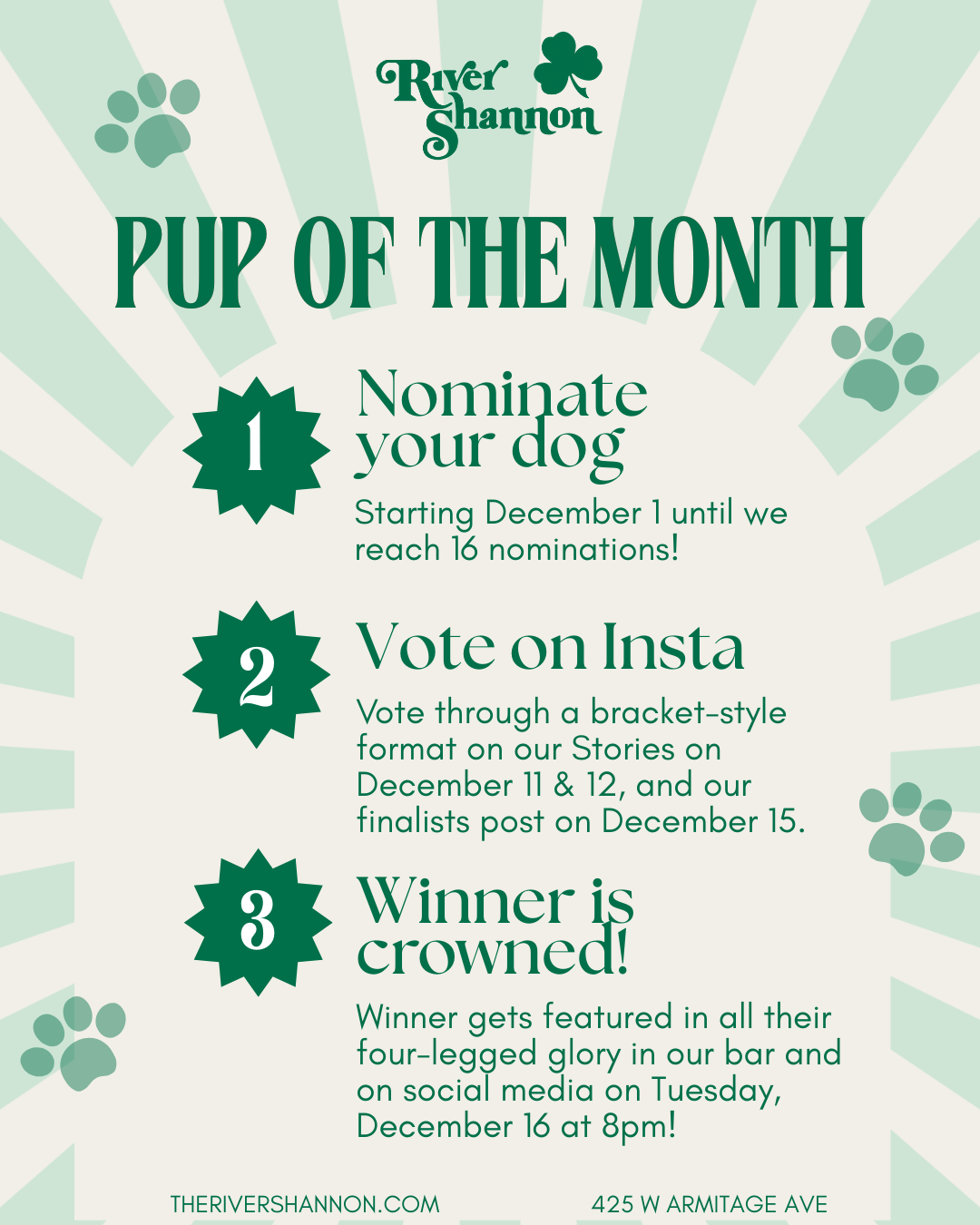 -The winner will be crowned Pup of the Month at our Coronation Party on Tuesday, December 16 at 8pm and get featured in all their four-legged glory in our bar and on social media!